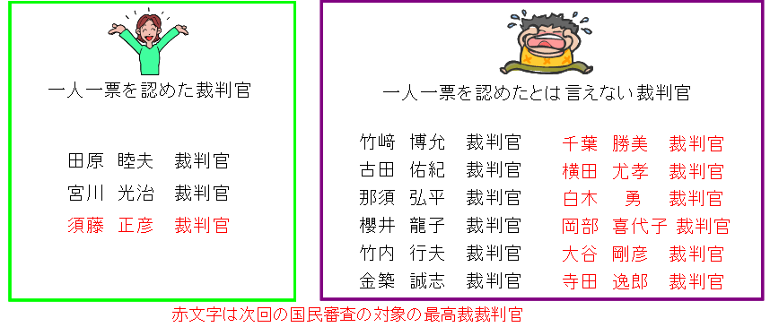 同判決のなかで、一人一票に賛成の意見を述べた裁判官、一人一票を認めたとは言えない裁判官は、下記のとおりです。表中の