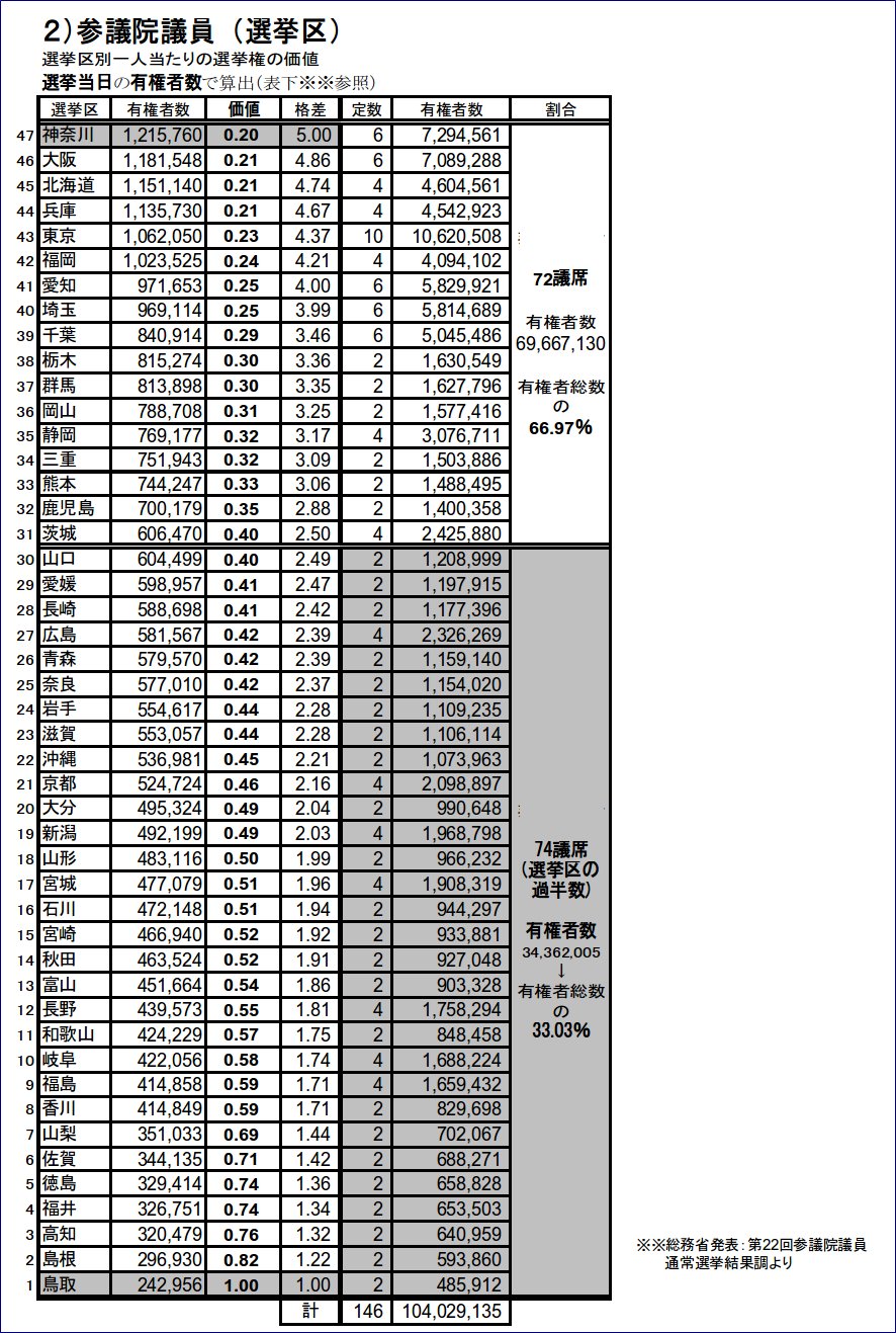 この結果、選挙区選出参議院議員の定員146人の過半数(74人)は、全登録有権者(1億400万人)のうちの3400万人(33%)が選び、残り7000万人の有権者(67%)は、72人の選挙区選出参議院議員しか選べません(下表を参照下さい)。