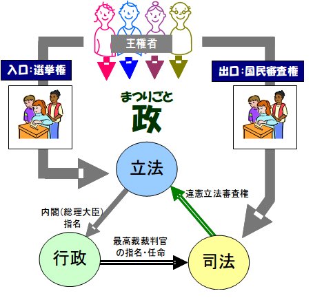 最高裁判所裁判官国民審査権は、選挙権と並ぶ、国民の参政権です。国の政(まつりごと)とは、立法、行政、司法の3権を指します。国民は、この立法、行政、司法の3権を支配する主権者です。